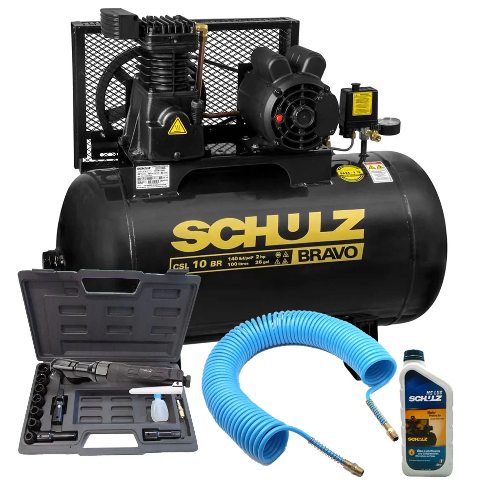 Compressor Profissional Industrial Schulz MONOCSL10BR + Catraca Pneumática 16 Peças + Mangueira Espiral 15m + Óleo – SCHULZ-K382
